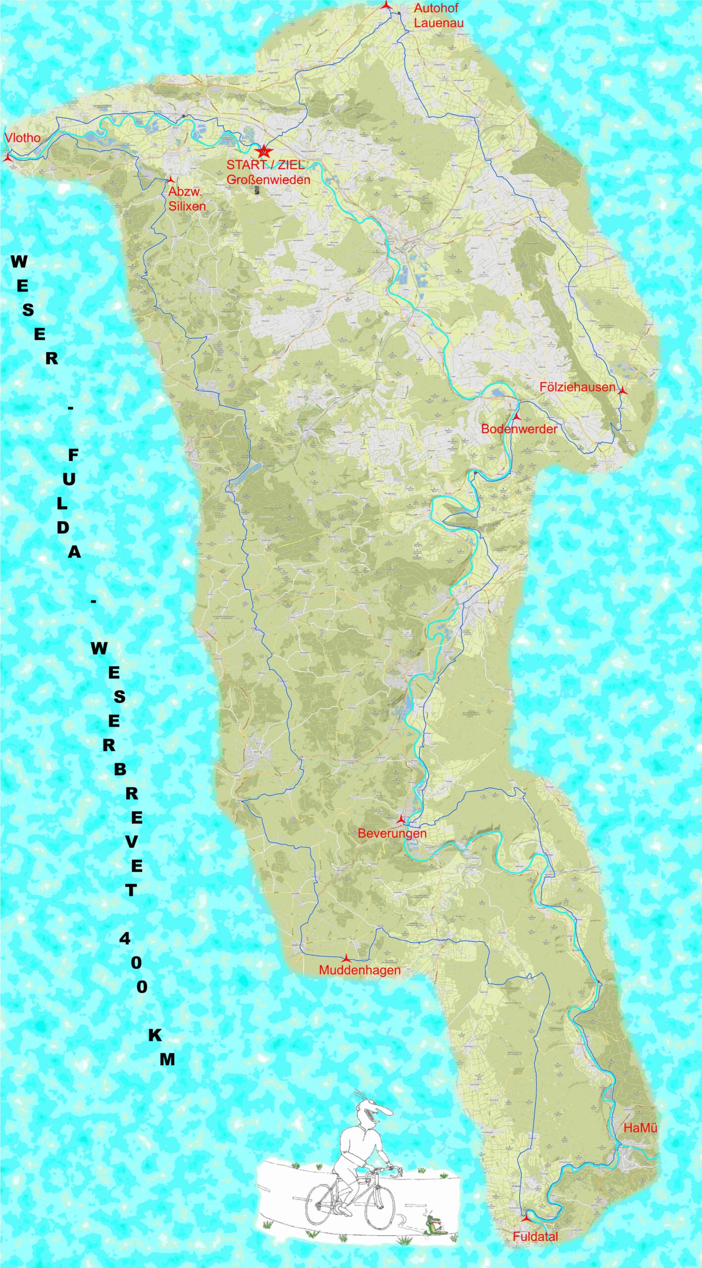 Der diesjährige 400er Brevet wird wieder zum Ursprungsort der Weser nach Hannoversch Münden führen. Er enthält neben vielen Anstiegen auch genügend ebenerdige Abschnitte, und ist daher bestens als Brevettraining geeignet.